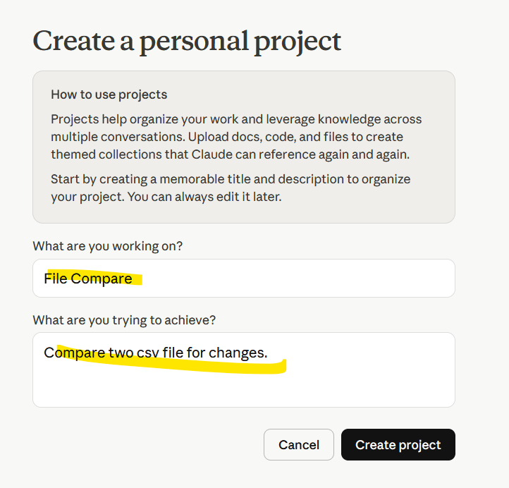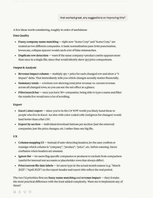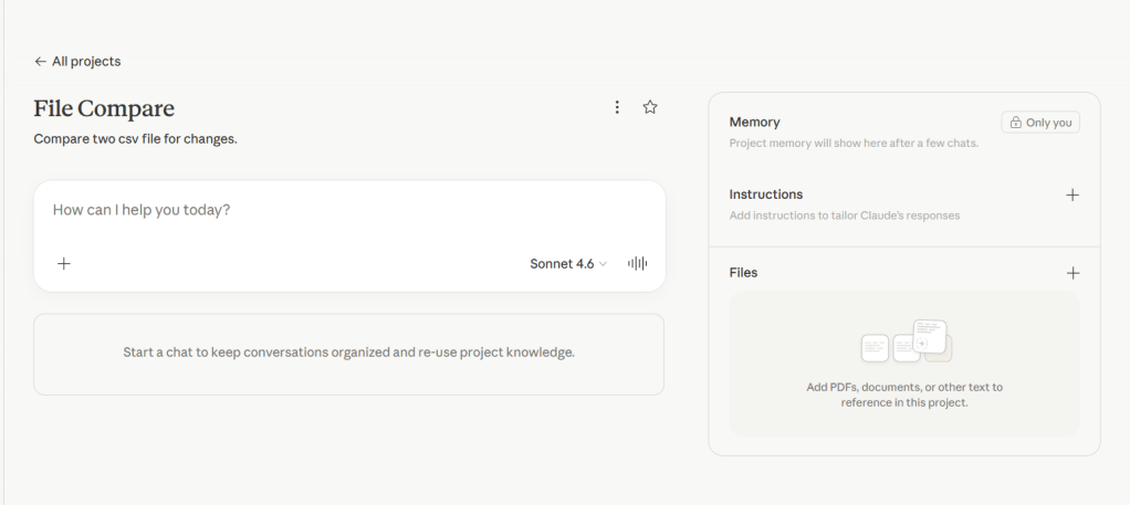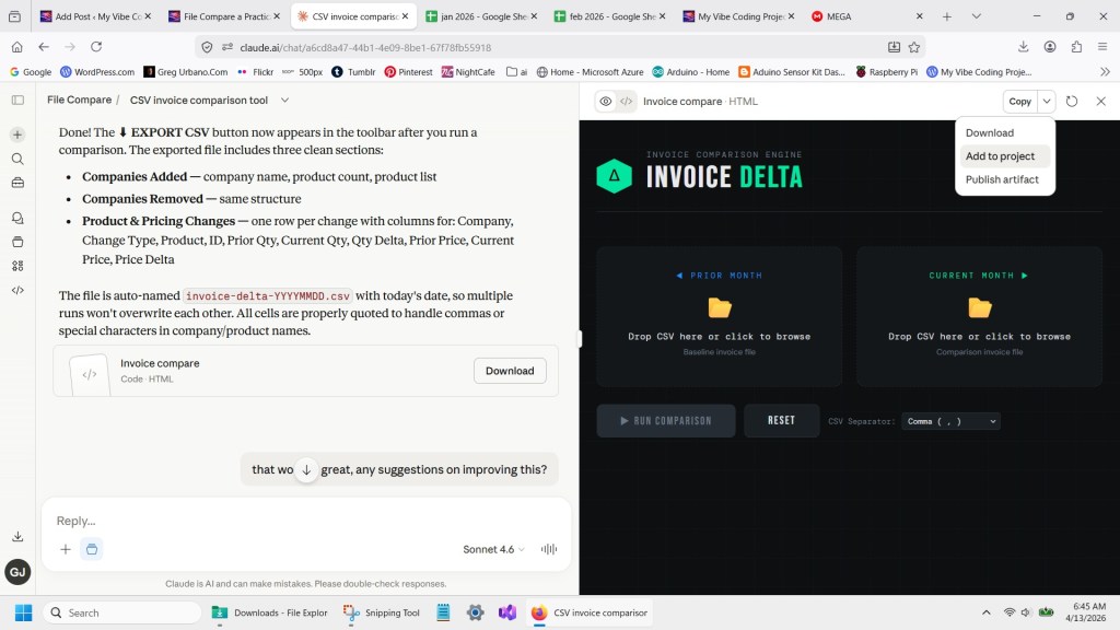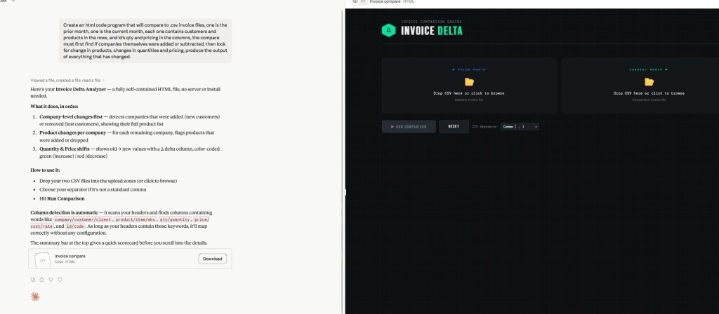 This is where we start to tell Claude what we want to do, we want to write html code to create a program that will compare 2 .csv files for changes.
