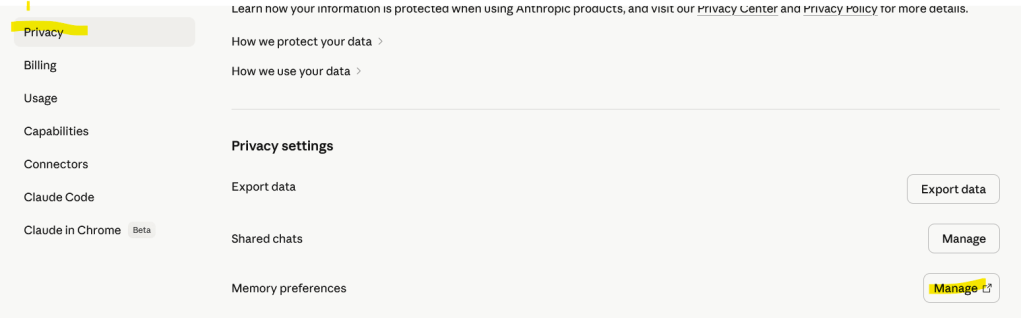 Click on “Privacy” and then “Memory preferences” then “Manage”