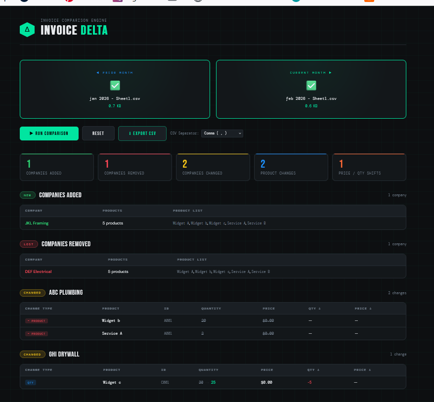 Create an html code program that will compare to .csv invoice files, one is the prior month, one is the current month, each one contains customers and products in the rows, and id’s qty and pricing in the columns, the compare must first find if companies themselves were added or subtracted, then look for change in products, changes in quantities and pricing, produce the output of everything that has changed.