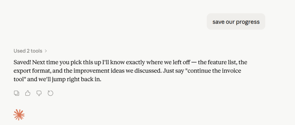 ps, for fute reference, be sure to tell Claude to save your progress to the project, andyou can also add the code to the project.