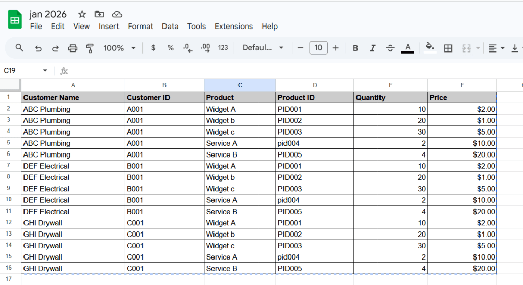 So to duplicate that here as an examples, i cannot use the real company invoices, but I created some in Google sheets, exported them as CSV files.
