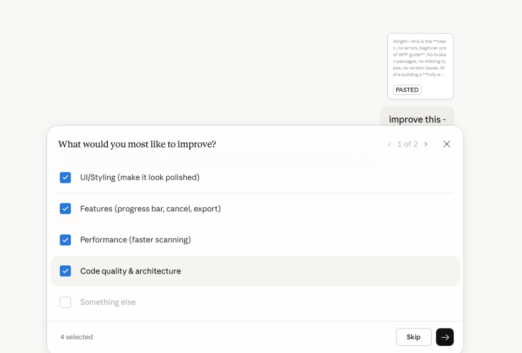 I start with my “Step=By-Step” prompt, right into the same chat window that produced the working console app.
